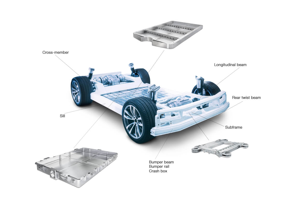 MODIG machining solutions for machining electric vehicle components: Battery trays, sub-frame. sill, longitudinal beam. cross-member, front-cradle. HHV an aluminum extrusion machining center that will secure your desired machining time
